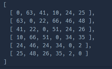 dist[출발지점][현재 정점]+dist[현재 정점][a의 도착지점]+dist[현재 정점][b의 도착지점]을 계산을 해보면(s=4, a=6, b=2는 다 -1씩 빼주기)i=0(정점 1까지 합승한다.) dist[3][0]+dist[0][5]+dist[0][1] 10+25+63 = 98 i=1(정점 2까지 합승한다.) dist[3][1]+dist[1][5]+dist[1][1] 66+48+0 = 114 i=2(정점 3까지 합승한다.) dist[3][2]+dist[2][5]+dist[2][1] 51+26+22 = 99 i=3(정점 4까지 합승한다.) dist[3][3]+dist[3][5]+dist[3][1] 0+35+66 = 101 i=4(정점 5까지 합승한다.) dist[3][4]+dist[4][5]+dist[4][1] 34+2+46 = 82 i=5(정점 6까지 합승한다.) dist[3][5]+dist[5][5]+dist[5][1] 35+0+48 = 83 이렇게 정점 5까지 합승하는 것이 최저 택시요금이 된다.
