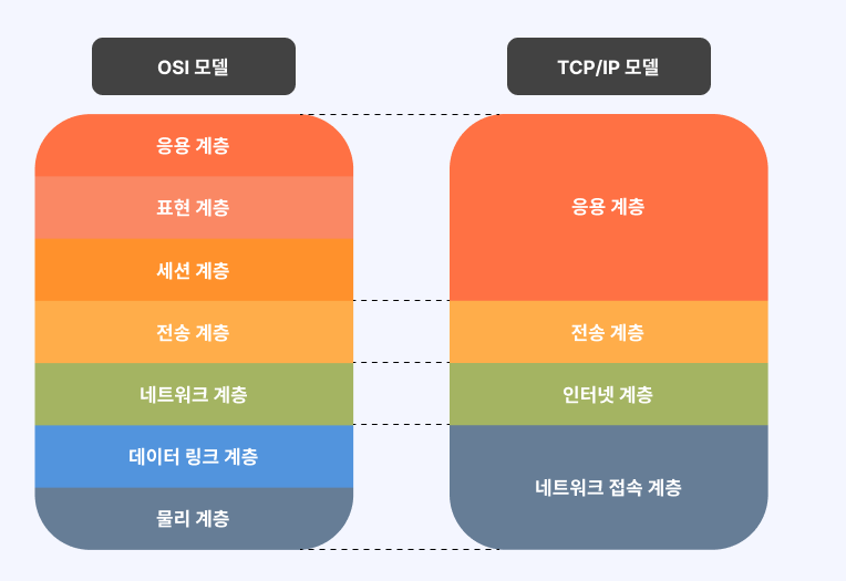 - OSI 모델과 TCP/IP 모델을 설명하세요. OSI 모델은 ISO에서 정의한 국제 통신 표준 규약이고, 네트워크의 기본 구조를 7 계층으로 나눠서 표준화한 통신 규약이다. TCP/IP 모델은 OSI 모델 7 계층에서 네트워크에서 데이터를 전송하는 과정을 4 계층으로 단순화시켜 사용하는 모델이다. 인터넷 모델이라고도 한다.