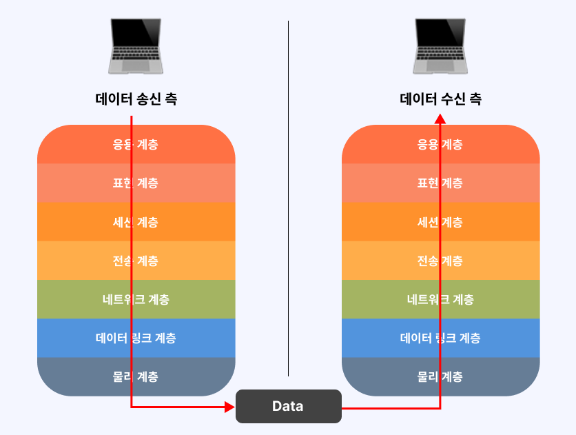 송신 측의 7계층과 수신 측의 7계층. - 송신 측(데이터를 전송) : 상위 계층 -> 하위 계층으로 데이터를 전송.