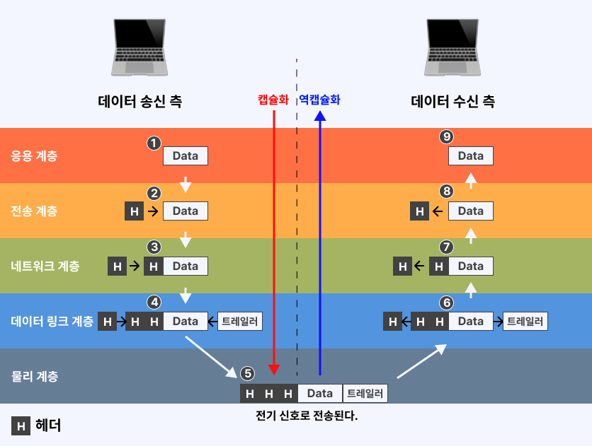 요청 데이터+전송 계층 헤더+네트워크 계층 헤더+데이터 링크 계층 헤더+트레일러)는 최종적으로 전기 신호로 변환되어 수신 측에 도착한다.이렇게 필요한 데이터를 추가하는 과정을 캡슐화라고 한다.