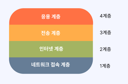 7 계층을 4 계층으로 바꿔서 생각하면 이해하기 쉽다. 이 4 계층 모델을 TCP/IP 모델이라고 한다.