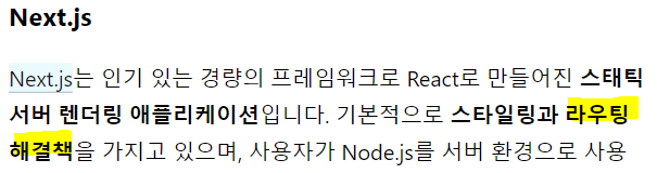 React 공식문서의 Next.js 소개를 보면 기본적으로 스타일링과 "라우팅 해결책"을 가지고 있다고 설명되어 있다.