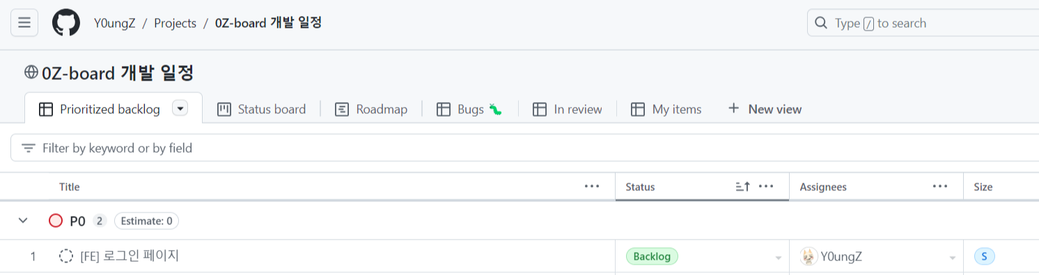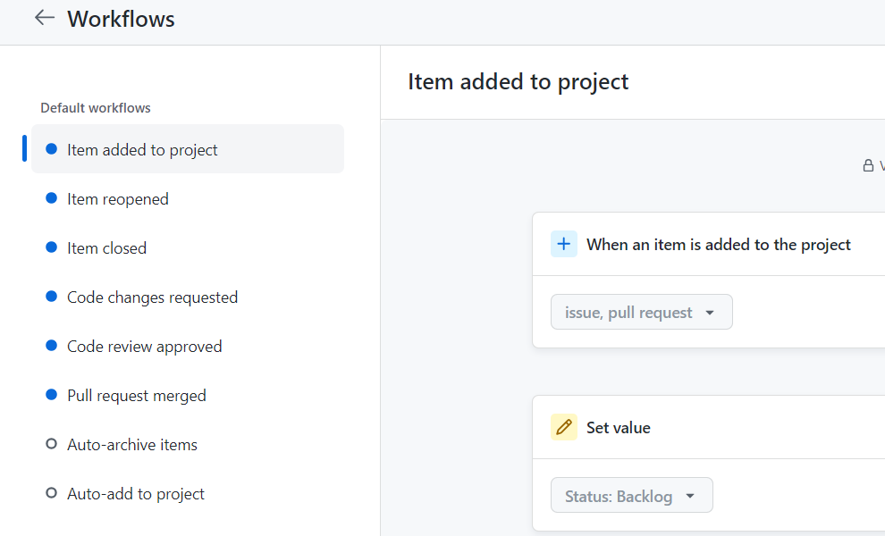 - Item added to project : issue, pull request 생성 시 Set value로 설정한 Status로 변경(ex. Backlog)