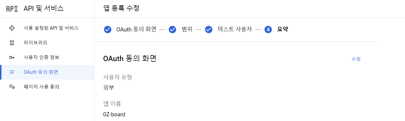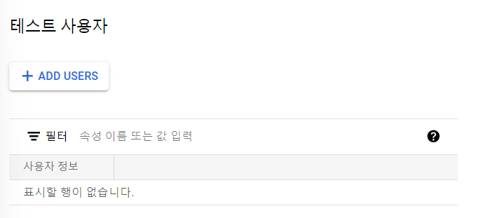 .../auth/calendar.을 추가한다면 이 범위는.../auth/calendar.readonly,.../auth/calendar.events.readonly등의 상위 범위이기에 하위 범위들이 모두 추가되게 된다. 프로젝트에서 사용할 API들이 설명에 다 포함되어 있어 설정했지만, 민감한 범위를 추가할 때는 정말 필요한 API만이 포함되어 있는지 확인하는 것이 좋아 보였다. 또한, 민감한 범위를 추가하면 구글에서 애플리케이션에 대한 인증을 거쳐야한다.테스트 사용자는 우선 추가 없이 넘어갔다.