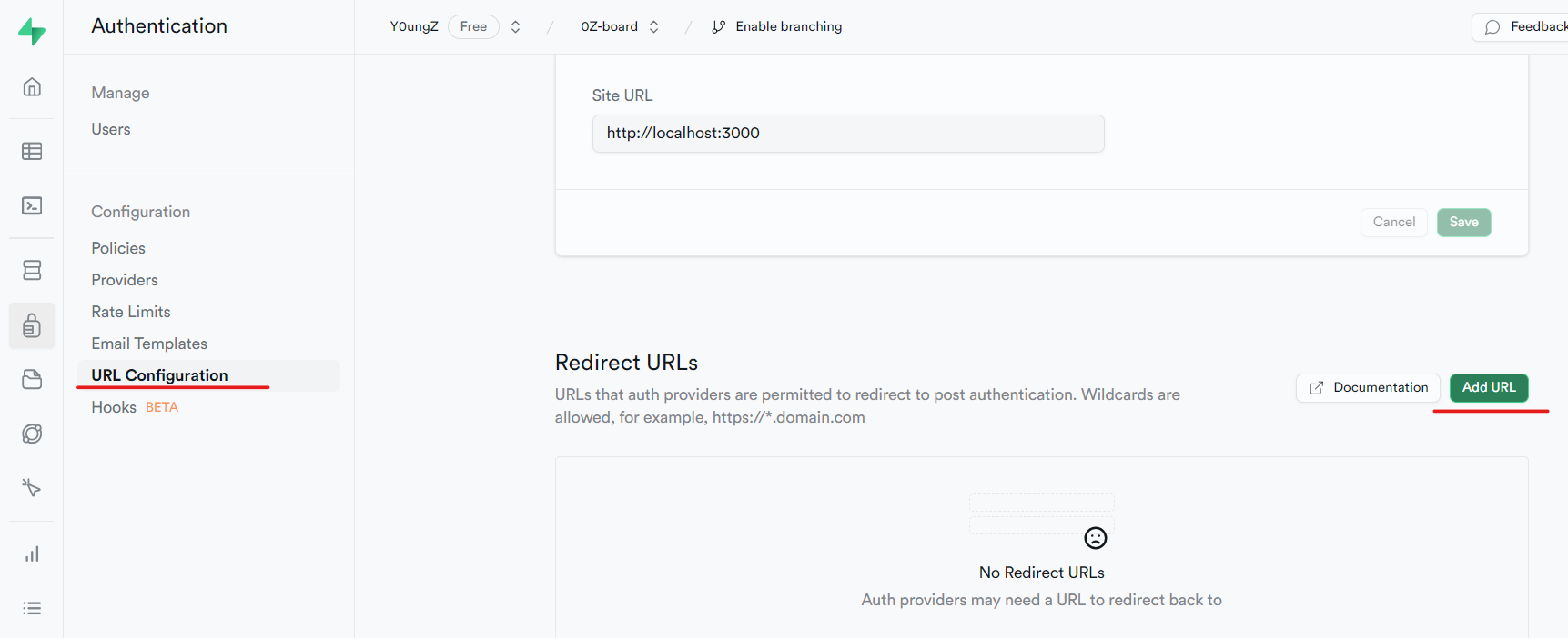 프로젝트 대시보드 URL Configuration -> Redirect URLs에서 Add URL로 웹 사이트 주소를 넣어준다(인증 성공 후 Redirect될 URL들).const { data, error } = await supabase.auth.signInWithOAuth({ provider: 'google', options: { queryParams: { access_type: 'offline', prompt: 'consent', }, }, })options에 아래 속성을 추가하면 oauth 요청 시에 query parameter로 access_type은 offline, prompt는 consent가 붙어 가게 된다.
