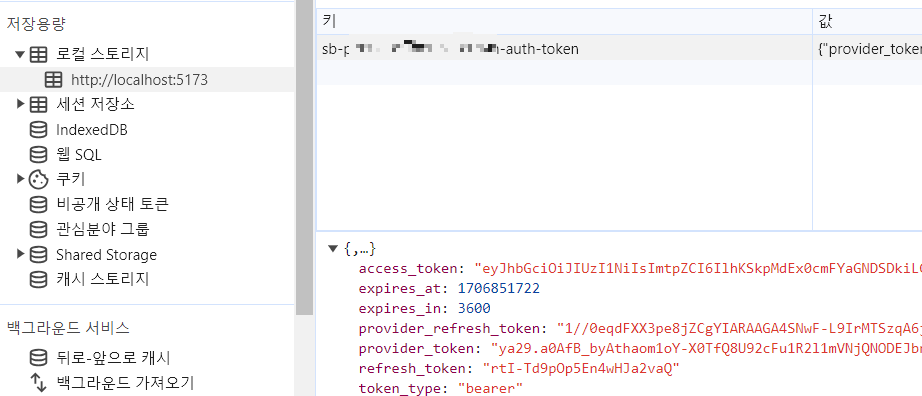 - SIGNED_IN : 필요한 정보(oauth_provider_token, oauth_provider_refresh_token)를 LocalStorage, SessionStorage, 메모리(React State) 등에 저장한다.