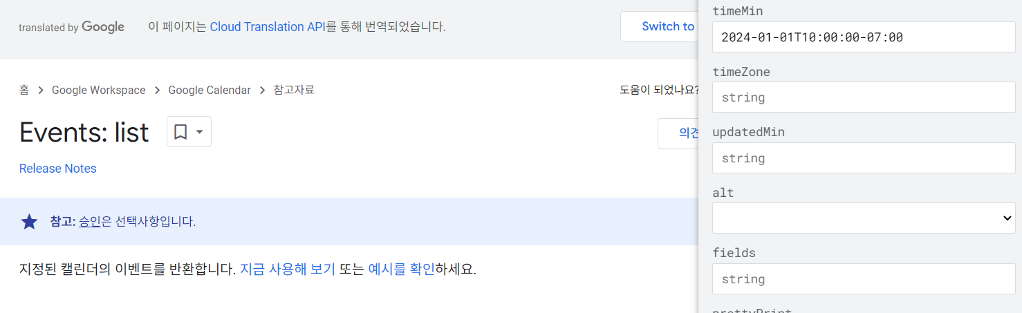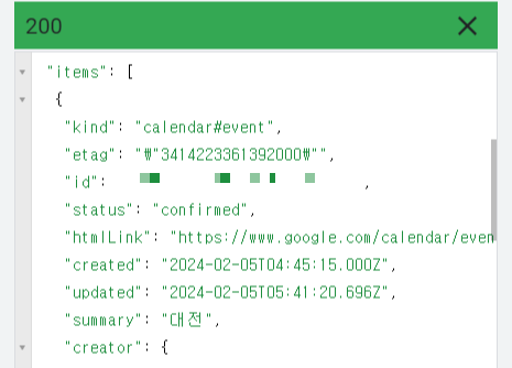 const response = await instance.get(`/calendars/${calendarId}/events`, { params: { timeMin: '2024-01-01T10:00:00-07:00', }, }); // 기본 설정 캘린더를 보려면 const response = await instance.get('/calendars/primary/events', { params: { timeMin: '2024-01-01T10:00:00-07:00', }, });아까 위에서 알아낸 calendarId로 요청해도 되고, 기본 설정 캘린더를 보려면 primary를 넣어 요청하면 된다.