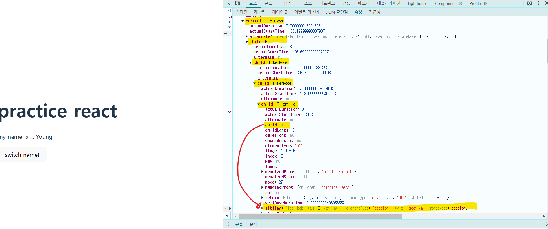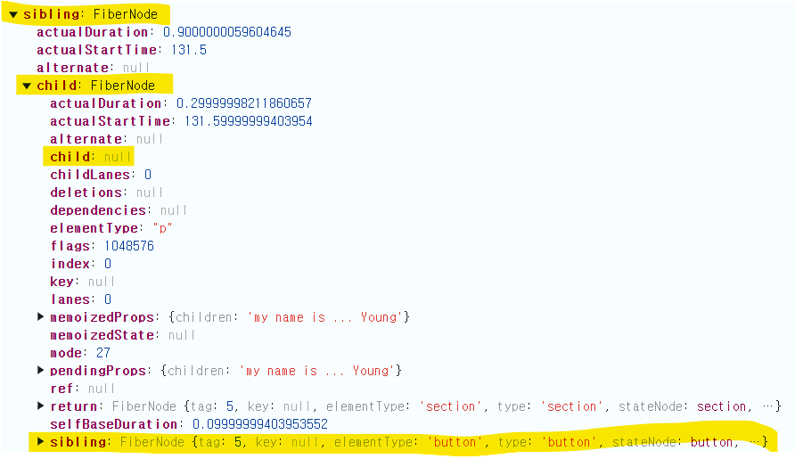 child를 타고 내려가보자... 여기서 Fiber의 sibling, child를 확실하게 이해할 수 있었다.