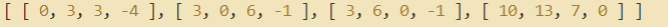 A B C D A 0 3 3 -4 B 3 0 6 -1 C 3 6 0 -1 D 10 13 7 0 최종 dist 배열은 위와 같이 만들어진다.
