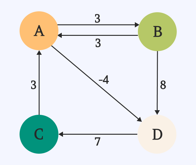 dist[I][J]에서 I===J일 경우) 0으로 초기화해준다. 음수 사이클을 검출하기 위해서다. 자기 자신을 경로로 갖는 사이클이 존재하고 그 경로가 계속해서 음수 가중치를 갖지 않는 한 자기 자신의 경로는 항상 0이 되어야 한다. 따라서, 탐색 후dist[I][I]<0이면 해당 그래프는 음수 사이클을 갖고 있다고 판단이 가능하다.A B C D A 0 3 INF -4 B 3 0 INF 8 C 3 INF 0 INF D INF INF 7 0 2. 경유지 정점을 설정한 후 경유지를 거쳐가는 경로의 비용이 더 적다면 갱신한다.