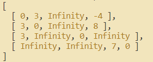 이 그래프의 모든 정점 - 모든 정점 사이의 최단거리를 구현해보자! //input.txt //첫번째 줄 : 정점의 개수, 간선의 개수 //두번째 줄 ~ : 간선 정보가 주어진다.(출발 정점, 도착 정점, 가중치) 4 6 1 2 3 1 4 -4 2 1 3 2 4 8 3 1 3 4 3 7정점과 간선의 정보를 받은 후 초기화를 먼저 진행해준다. (기본 이해의 1번) 자기 자신으로 가는 경로는 0으로, 간선이 있다면 그 가중치를, 경로가 존재하지 않는 다면 Infinity로 초기화를 해준다.